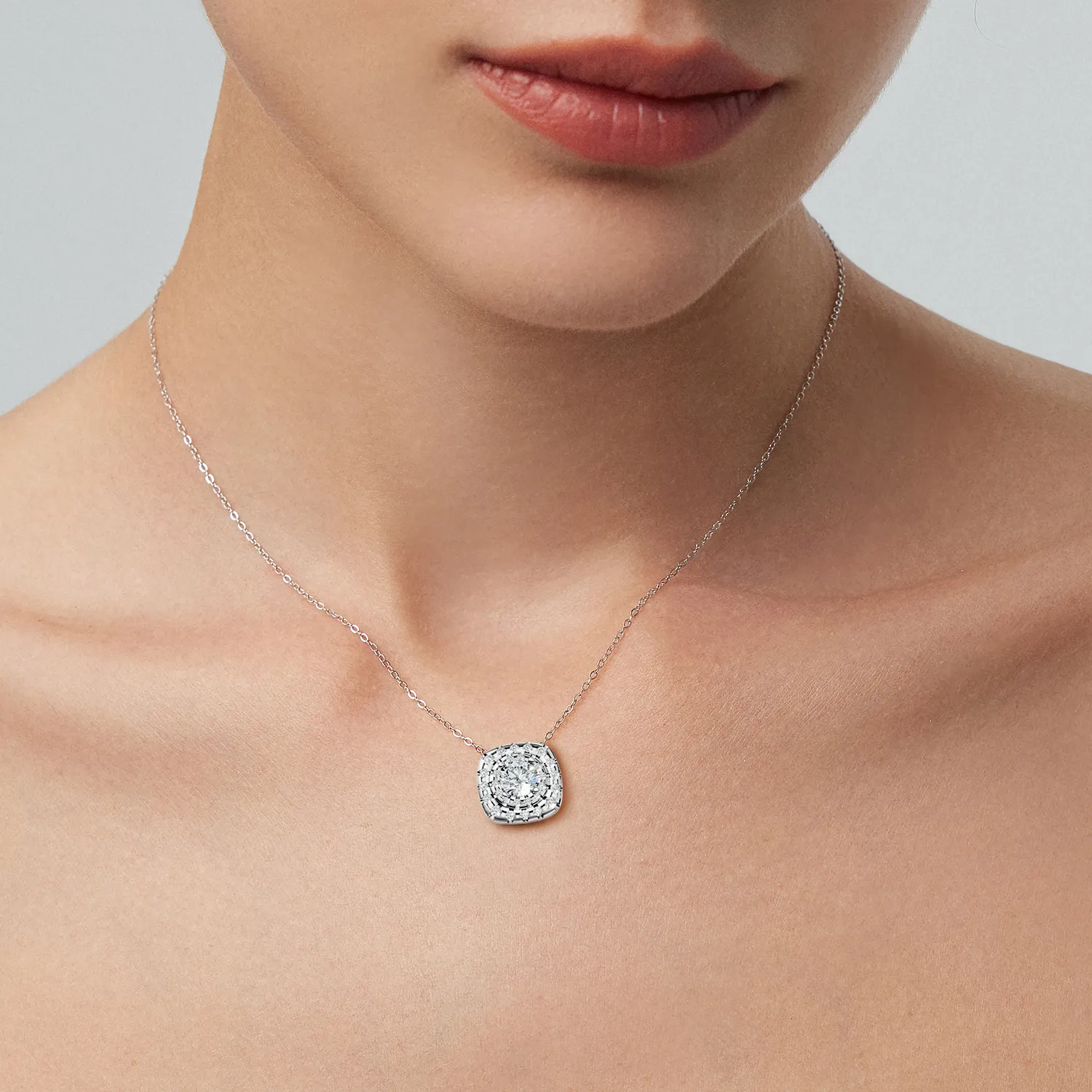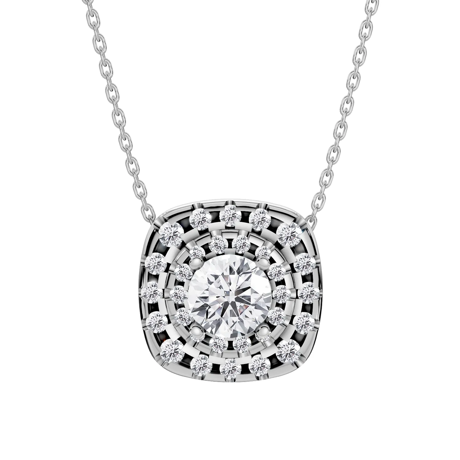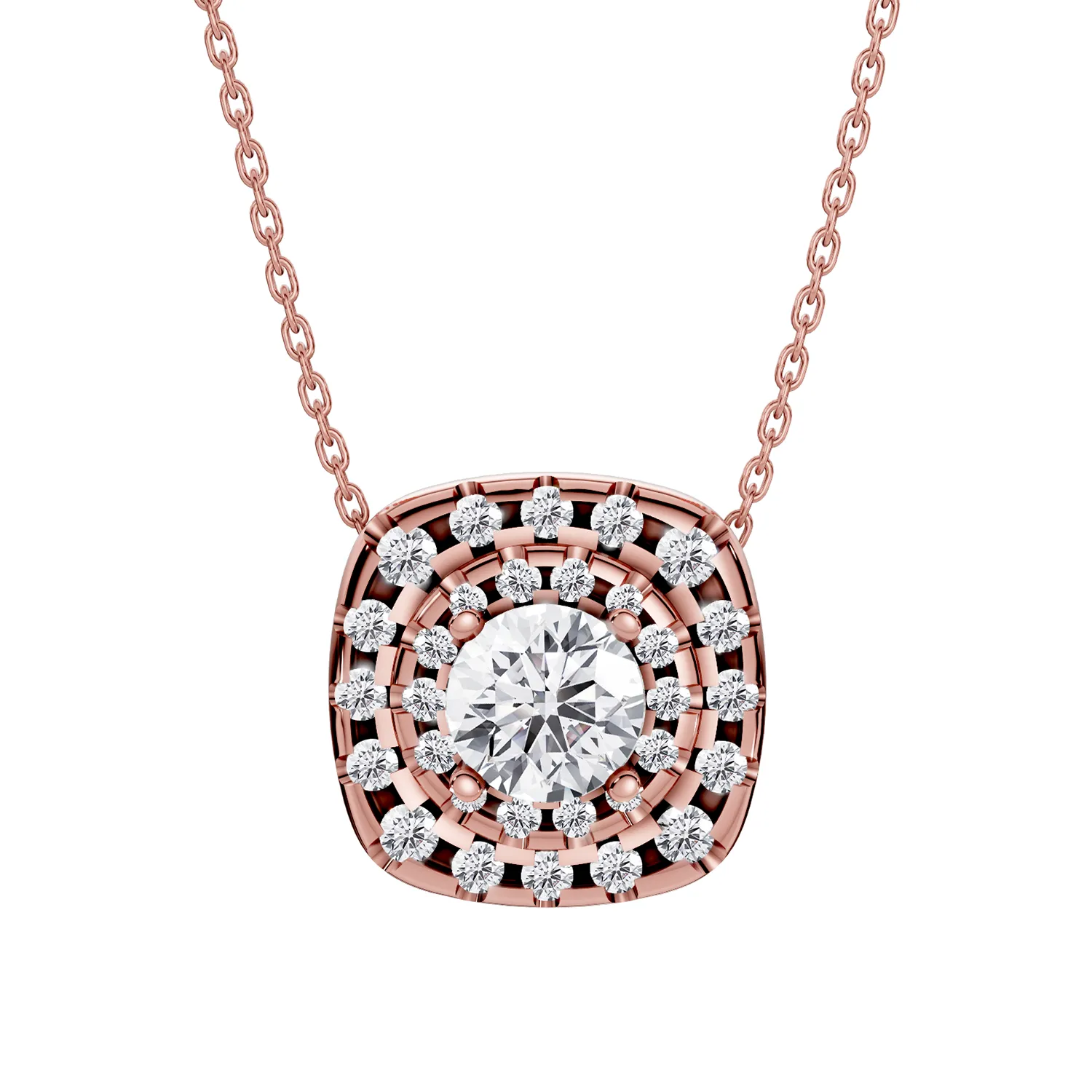 This Round Diamond Double Halo Pendant Necklace features a brilliant round center stone in a basket prong setting, encircled by two cushion-shaped halos of pavé diamonds. The soft square contour adds dimension and contrast, giving the classic round diamond a modern twist with striking sparkle and elegant balance.