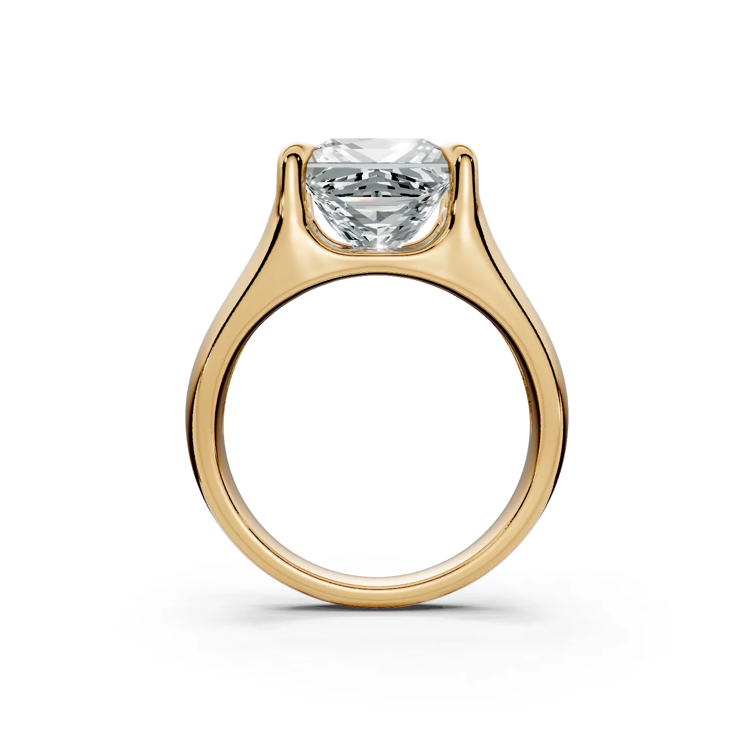 This sleek solitaire ring showcases 9-option-cut diamond in a classic four-prong setting. The polished gold Y-shank splits midway, creating bold, modern lines and a sculptural silhouette